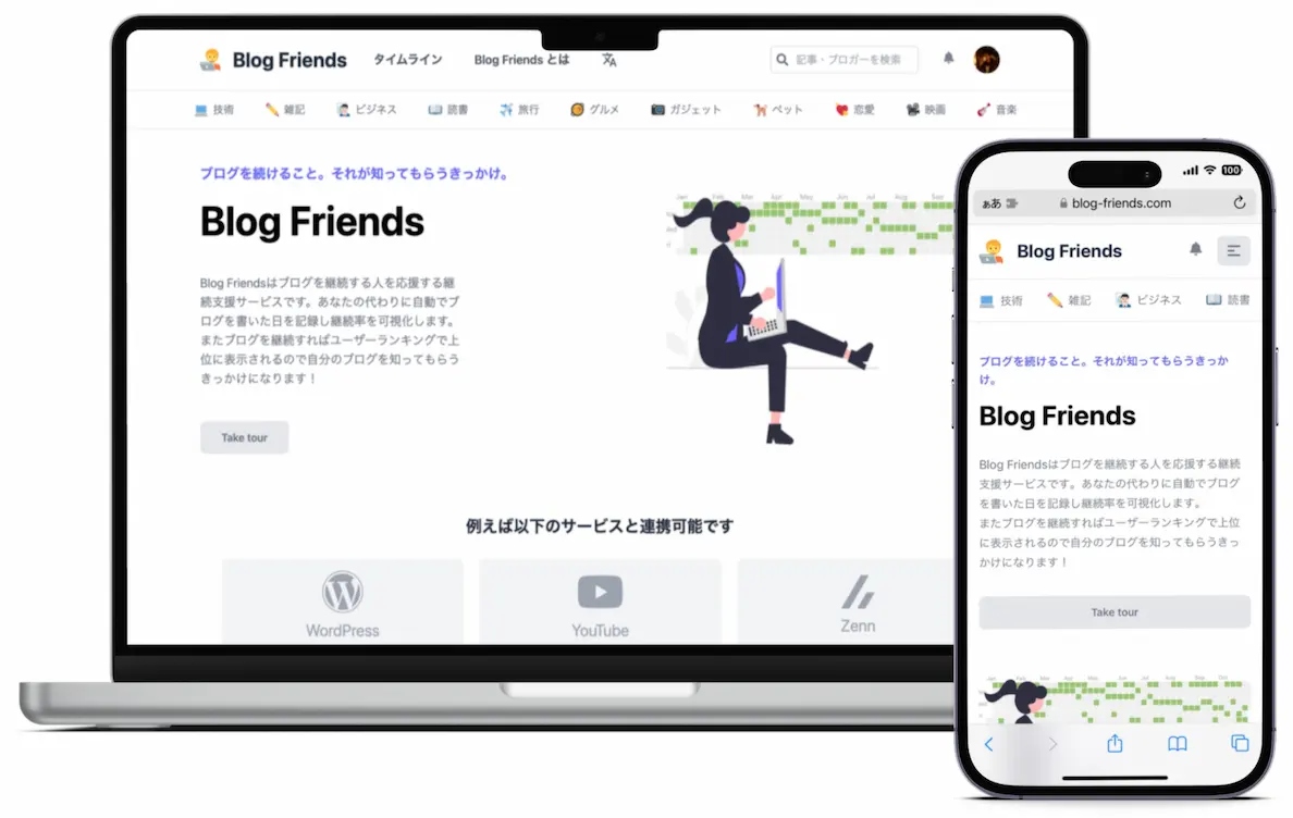 Blog Friends is a blogging support service that encourages people to continue writing. It records the days you wrote blog posts and visualizes your consistency rate. Compete on user rankings and get your blog read by more people.