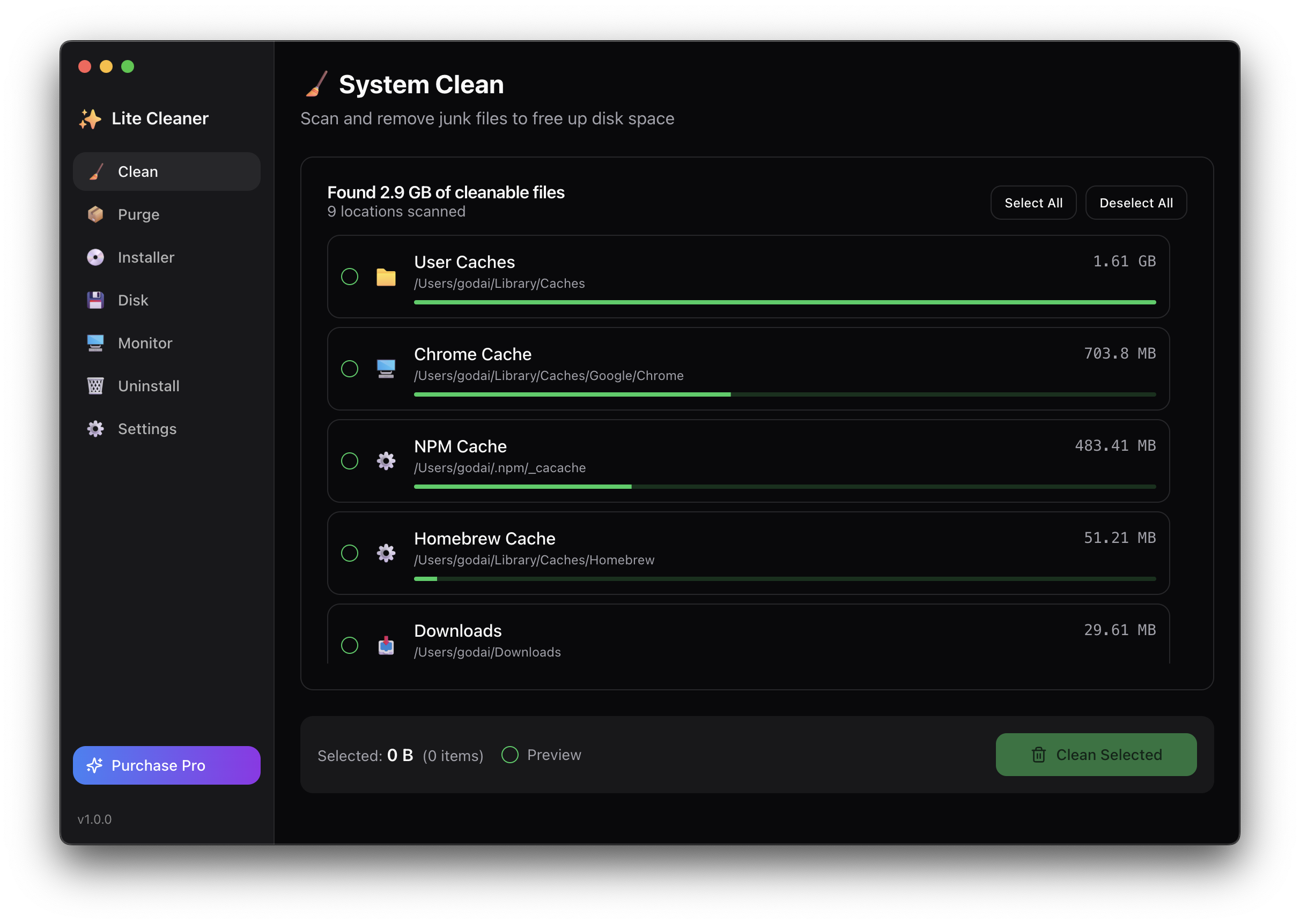 A Mac utility app that helps you clean up storage effortlessly. Safely remove unnecessary caches, build artifacts, and installer files to free up disk space.