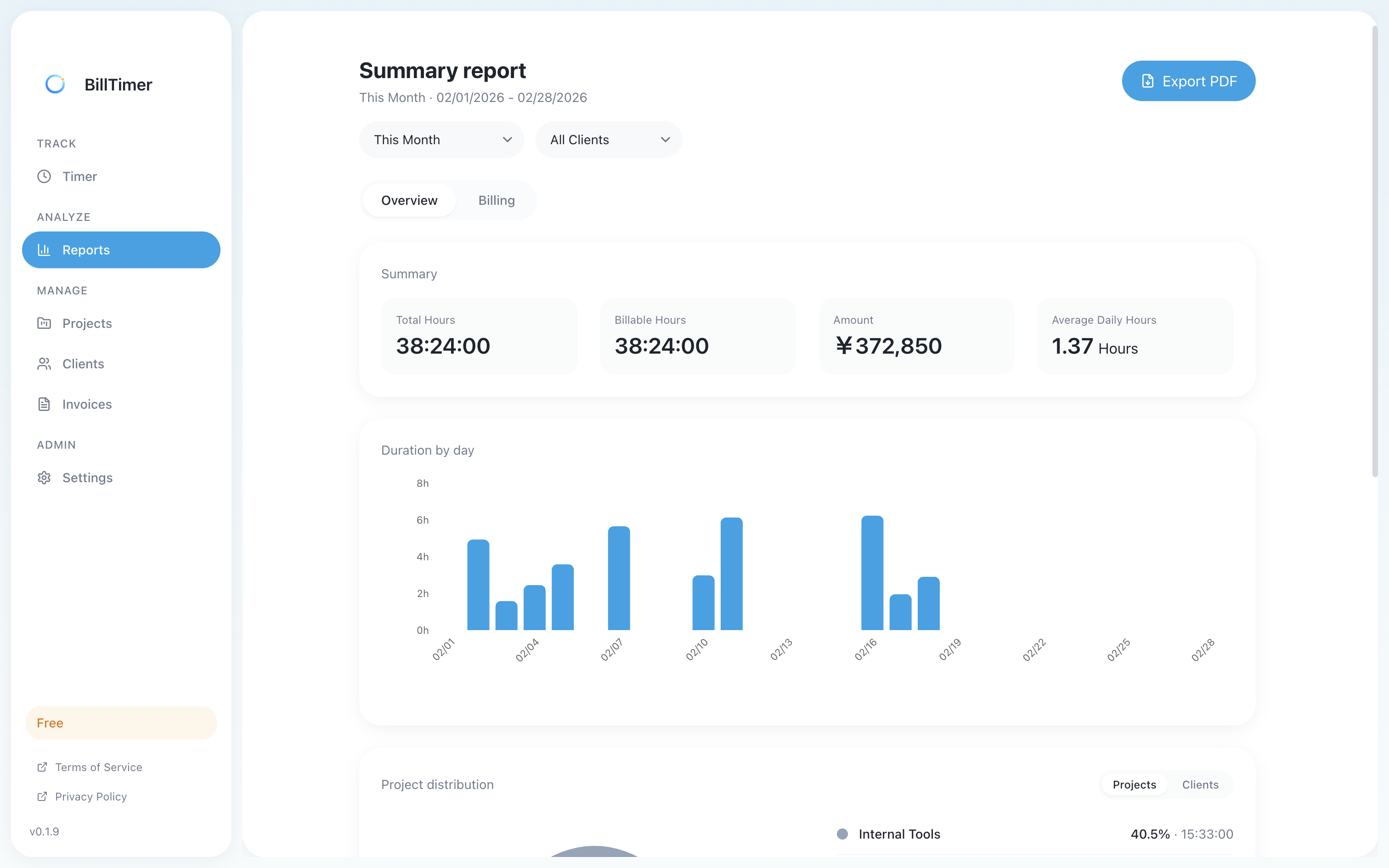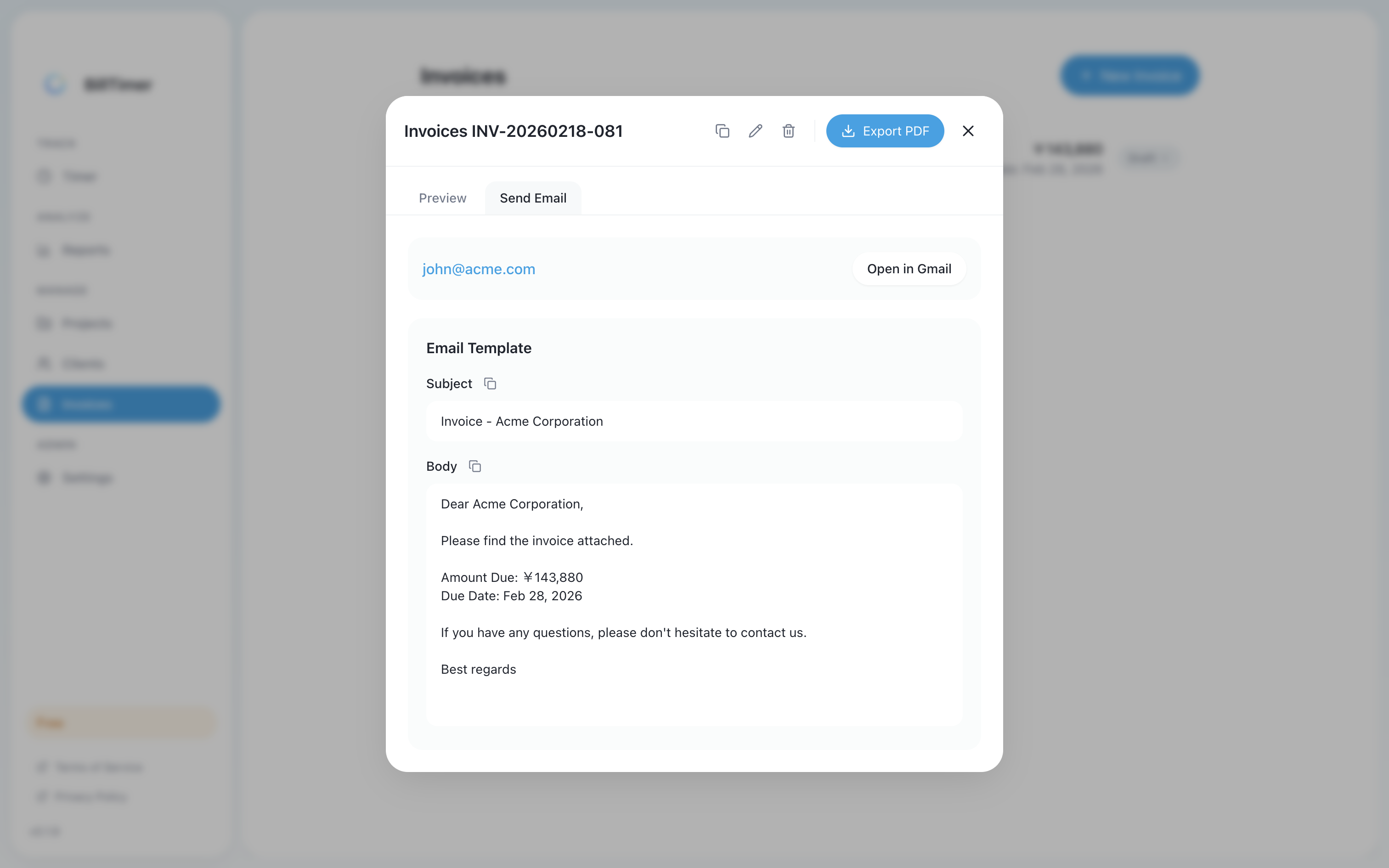 Generate beautiful invoices from tracked time. Export to PDF and send directly to clients.