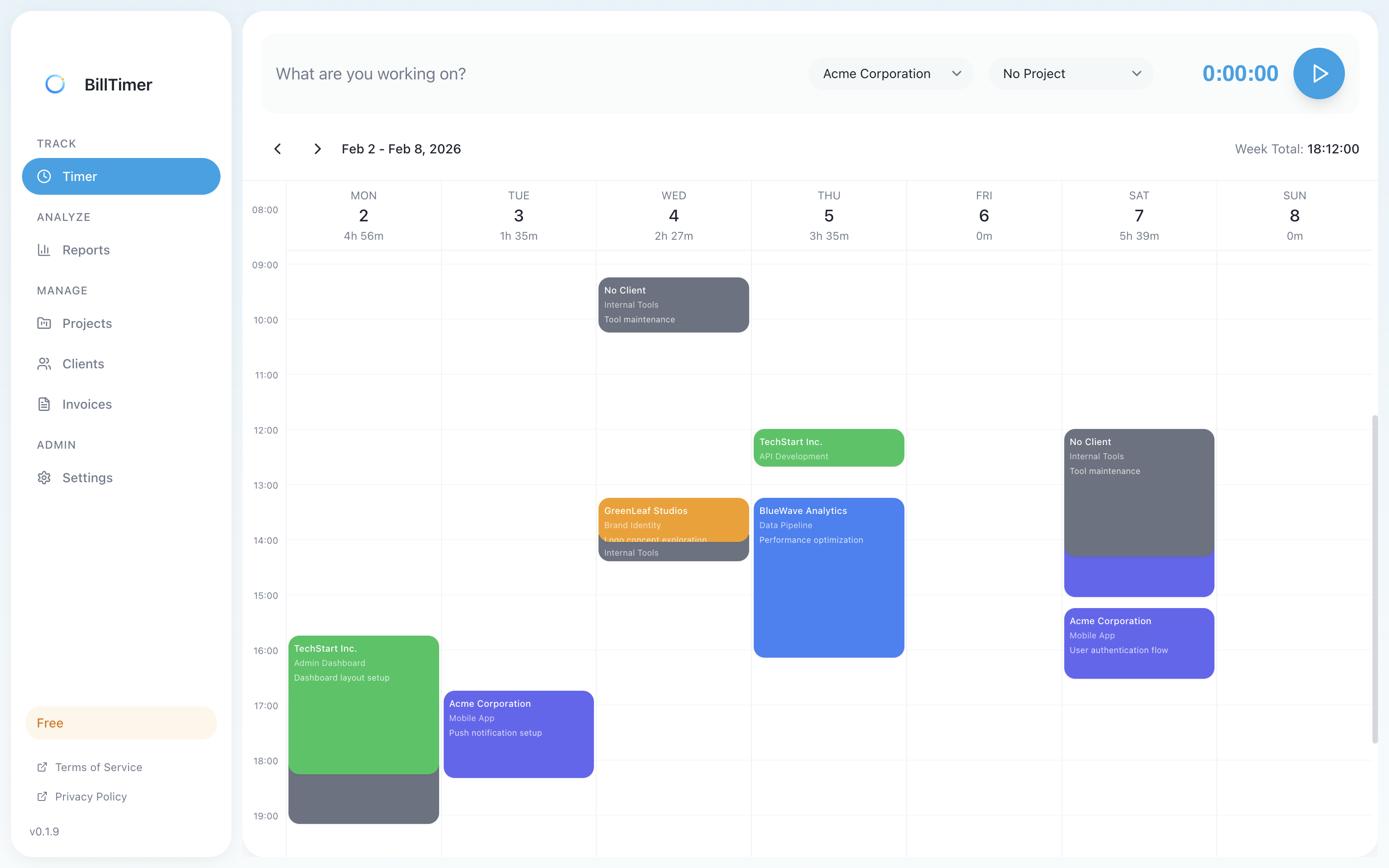 Organize your work by client and project. Set hourly rates and track billable vs non-billable time.