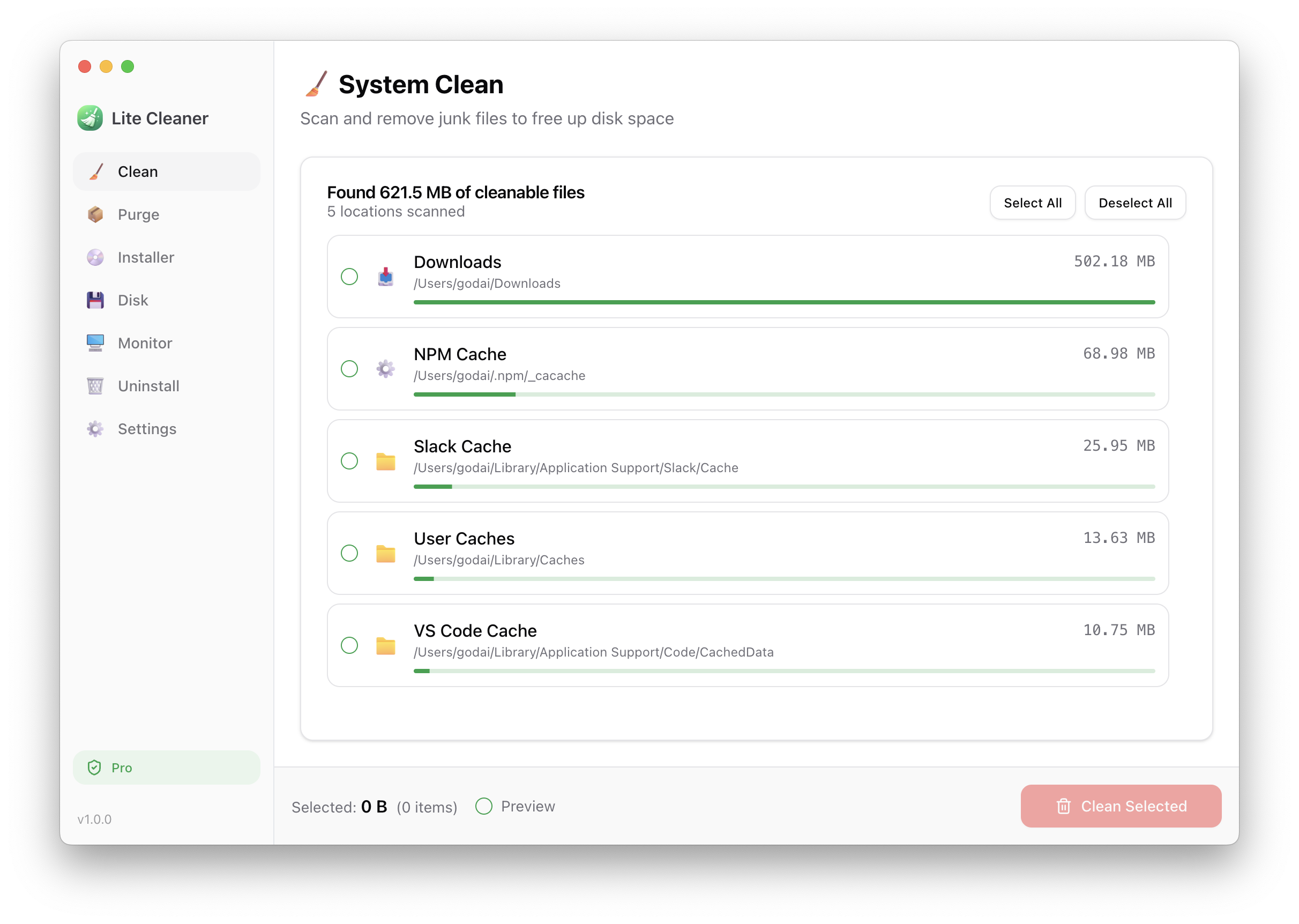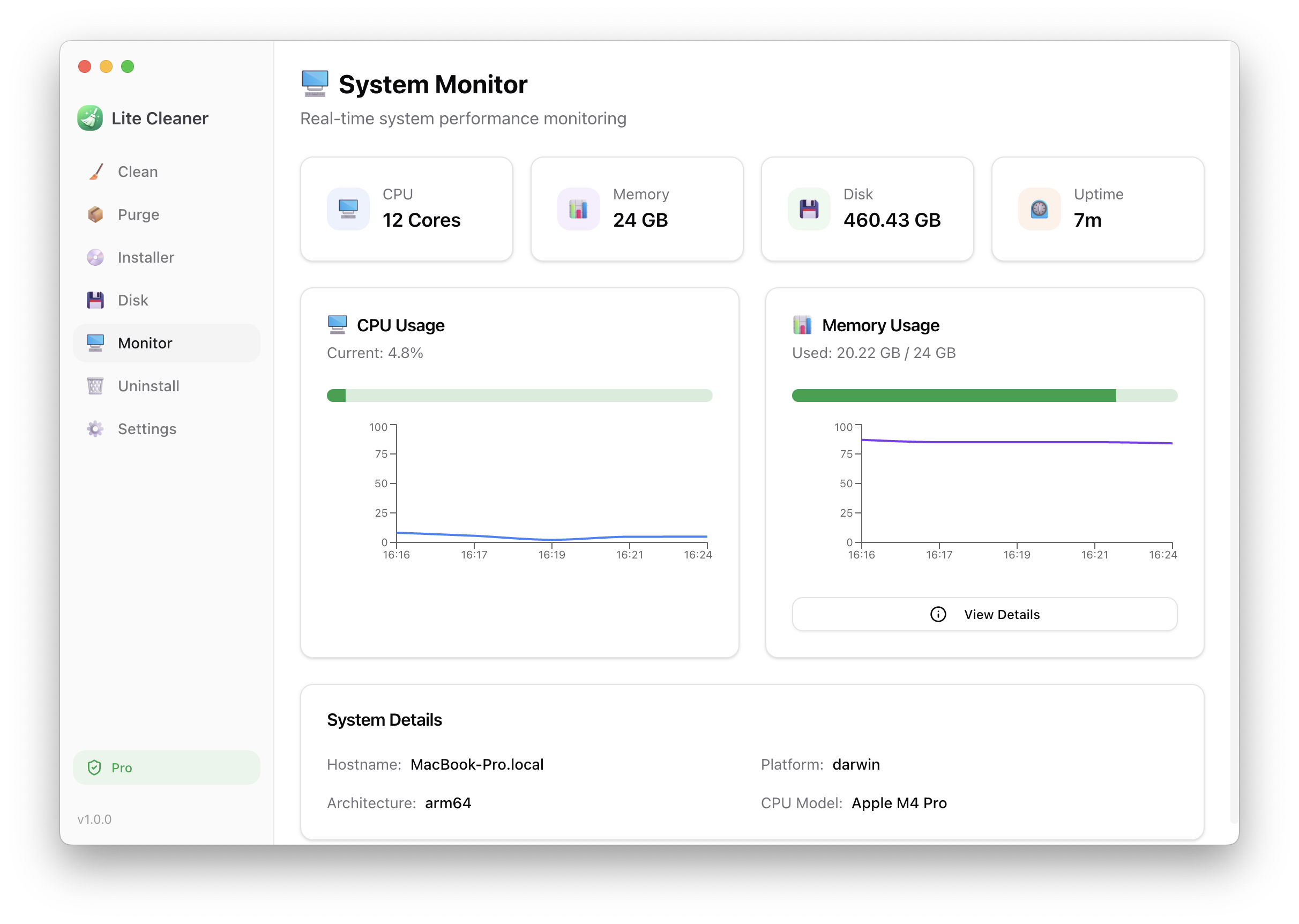 Lite Cleaner supports macOS 12 (Monterey) and later. It works on both Apple Silicon (M1/M2/M3/M4) and Intel Macs.